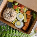 Grilled Salmon Boiled Egg Brown rice Lettuce Cherry Tomato Sweet Corn Onion Homemade Lemon sweet sauce and Shrimp CHILI