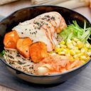 Salmon And Chicken. Boiled Egg SweetPotato Lettuce Cherry Tomato Sweet Corn Onion Homemade Lemon sweet sauce and Shrimp CHILI