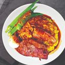 Spicy fried chicken served with Rice and a variety of flavorful curries and sides.