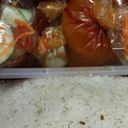 Fluffy white rice with spicy chilli paste and sliced cucumbers, served with chicken in spicy tomato sauce