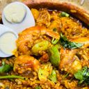 Grilled prawns marinated in a spicy and tangy sauce, served with aromatic rice.
