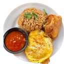 Fried rice cooked with chilli paste, anchovies, leafy greens and lettuce. Served with pounded fried chicken