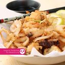 Crispy tempura-battered squid served with a zesty dipping sauce and fresh lemon wedges.