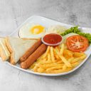 Classic American breakfast with eggs, bacon, toast, and hash browns.
