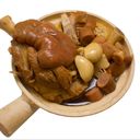 The dish consists of pork ribs stewed with a mixture of fragrant herbs and spices such as garlic, cloves, cinnamon, star anise, fennel seeds and coriander. 内含腐竹,豆腐 卜,蘑菇,猪肉。