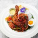 Blue pea flower rice, whole leg ayam goreng berempah, sambal belacan, telur masin, acar rampai, rempah crumbs and kuah of choice