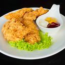 Crispy buttermilk chicken served with fluffy rice and a side of tangy dipping sauce.