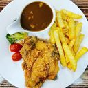 For ref only: deep-fried marinated chicken covered in black pepper sauce, served with fries & salad