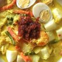 Rice cakes topped with turmeric and coconut milk gravy filled with vegetables and egg
