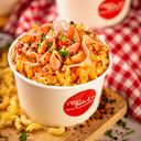 Super indulgent, creamy bowl of perfection served with golden cheesy sauce, macaroni pasta, chicken slices and stringy Mozzarella toppings. This is the dish of your dreams.