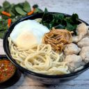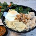 Savor our Spanish Ban Mee: stir-fried noodles with fresh spinach, vibrant spices, and savory toppings.