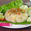 Fragrant fried rice wrapped in an omelette, served with shrimp, vegetables, and a spicy sambal.