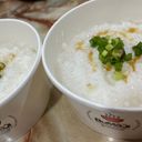 Bubur ayam, bawang goreng, daun sup / bawang, minyak bijan, serbuk lada hitam