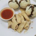 A serving of 1 person chicken paired with chicken rice balls, soy sauce, with chilli sauce & packed separately