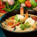 Spicy rice noodles in fragrant broth, topped with fresh herbs, vegetables, and succulent seafood.