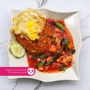 Spicy chicken cooked separately with carrots, long beans & cauliflower. Rice is fried with mixed vegetables & served together with sliced cucumbers