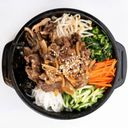 Rice topped with minced chicken & a variety of colourful vegetables. Mixed at the red pepper paste sauce & sesame oil. Table with red spicy gochujang