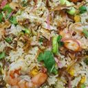 Thai style stir-fried rice cooked with squid, prawn and herbs