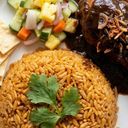 Nasi tomato + Daging hitam + Ayam Bawang + Sayur + Papadom