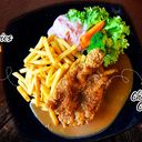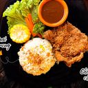 Fried rice, fried chicken thigh with coleslaw, fries and black pepper sauce
