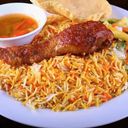 Fragrant basmati rice layered with spiced chicken, served with tangy pickles and aromatic herbs.