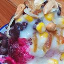 Shaved ice with nutmeg, nuts, mixed grass jelly, creamy corn and red bean.