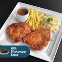 Chicken chop, black pepper sauce, pasta, coleslaw & French fries