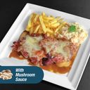 Chicken chop, mushroom sauce, rice, coleslaw & French fries