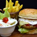 Pan-fried homemade chicken burger with melted cheese. Served with coleslaw & French fries