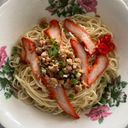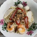 Savory noodles tossed in a rich, aromatic sauce, topped with fresh vegetables and tender chicken.