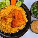 Succulent Mendy chicken, marinated with spices, served with fragrant rice, perfect for sharing.