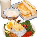(Tomyam Bee Hoon / Nasi Lemak) + (kaya butter / butter sugar / peanut butter ) + half boiled egg + soy milk