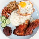 Fragrant, aromatic rice cooked in coconut milk, served with crispy fried chicken, fried anchovies, peanuts, and sliced cucumbers