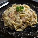 Spaghetti ,mushroom,chicken ham and topping smoked duck slices