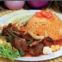 Fried rice served with beef cooked in a fragrant spicy tomato sauce