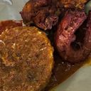 Ayam goreng berempah menggunakan ayam potong 4. Di hidang bersama 3 jenis kuah yang dicampur sekali