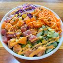 Salmon Sashimi, Japanese cucumber, Carrot, Corn, Purple Cabbage. Green Lettuce, House Marinated Poke Sauce, Spicy Mayo, Seaweed, Sesame Seeds.