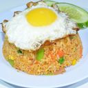 Basic fried rice cooked with chilli paste, anchovies, leafy greens and lettuce. Served with fried egg