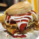 Double grilled chicken patty wrapped in egg, fresh veggies, creamy sauce, nestled in a soft bun