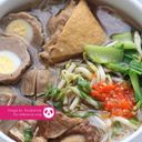 Flat rice noodles topped with soup, egg, chicken, water spinach, pounded groundnuts, lime juice and spicy soy sauce