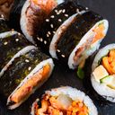 Kimbap roll with chicken sausage, crab stick, pickled radish, sauteed carrots, Tteokbokki sauce *No custom changes available, photo for illustration only.