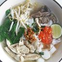 Vermicelli topped with soup, sliced chicken, water spinach, pounded groundnuts, lime juice and spicy soy sauce