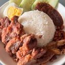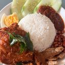 Fragrant rice cooked in coconut milk and pandan leaf. Served with fried anchovies, deep fried spiced chicken, sliced cucumber and boiled egg