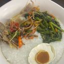 Savory rice porridge topped with tender chicken, aromatic herbs, and a hint of spice.