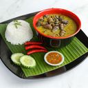 Nasi putih, ayam berempah, timun, sambal belacan dan kuah masak lomak.