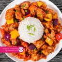 Pork cooked in sweet and sour sauce with diced tomatoes, diced pineapple bits, onions and diced cucumbers. Served with white rice