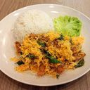 Savory chicken stir-fried with aromatic spices, served over fragrant rice.
