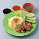 Aromatic rice cooked with chicken stock and served with roasted chicken, chili sauce, soy sauce, soup and sliced cucumbers