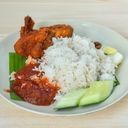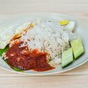 Fragrant rice in coconut milk, with chicken cooked in spicy dried chili sambal Served with peanuts, anchovies and sliced cucumbers