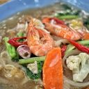 Hidangan mee kuew teow yang dimasak dengan gaya kung fu, menampilkan bahan-bahan pilihan dalam kuah yang kaya rasa.